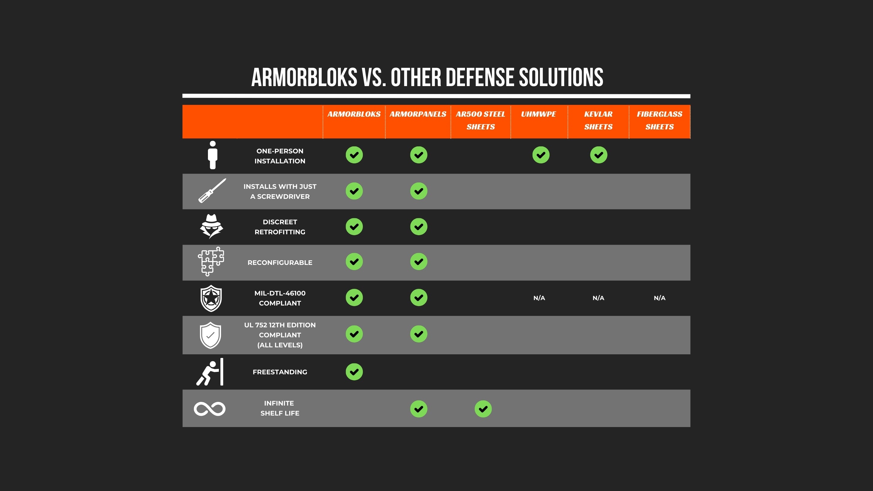 Armorbloks is the only ballistic solution on the market that is light enough to be carried and assembled into structures by just one person. For comparison, competitor steel panels are extremely heavy, and you can rarely purchase those panels in a size that can be carried or cut without expensive machinery. With Armorbloks, the weight of the steel is distributed due to its modular design, allowing you to build your own custom fortifications with nothing but a screwdriver.